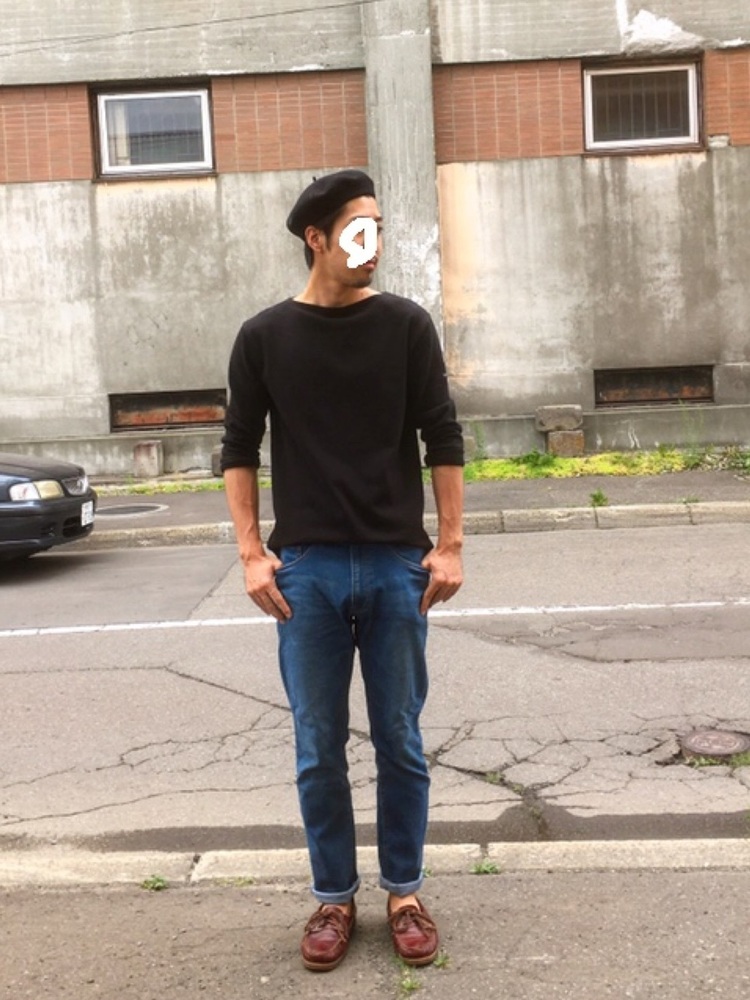 黒のカットソーにジーンズを合わせたシンプルなメンズコーデです。こちらのように袖をまくれば、長袖でも半袖のように夏コーデに活用できます。ベレー帽とローファーが知的さを感じさせるアクセントになり、シンプルな着こなしを引き立てていますね。