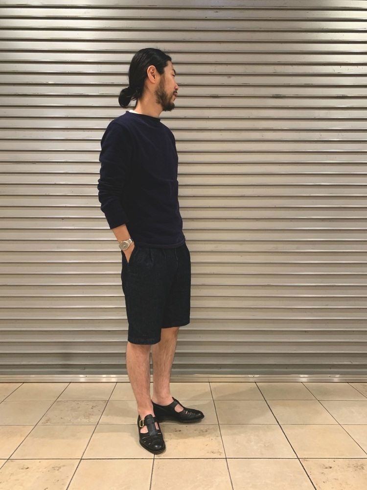 シンプルなワントーンだけに、服やシューズのシルエットのよさが際立つコーデです。カジュアルアイテムのデニムショーツを合わせても、ボートネックのカットソーが品のよさをキープ。袖まくりにシルバーの時計も映えます。