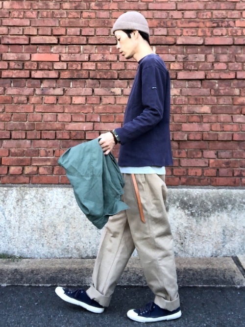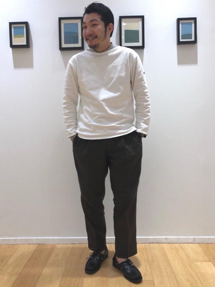 セントジェームスの無地カットソーにグレーのカットソーを合わせたシンプルなカジュアルコーデです。腕のブランドタグがさりげないアクセントになり、こなれ感のある着こなしになっています。無地のシンプルさゆえに、シルエットの美しさが際立っていますね。