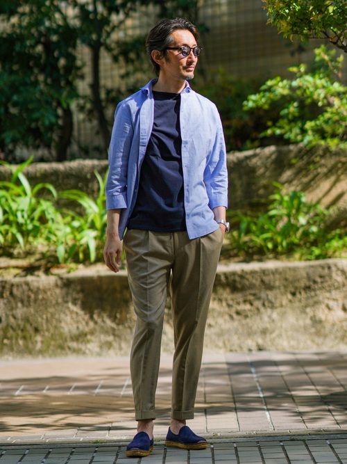 しっかりとした厚手のコットン生地の無地カットソーは、一枚での着用はもちろんのこと、重ね着にもとても便利です。上質な厚手のコットン生地なので、きれいめのアイテムとも違和感なく馴染みます。こちらのコーデのように、柄物のシャツやアクセントになるカラーのアイテムなど、合わせるアイテムの幅が広がるのも無地ならではです。