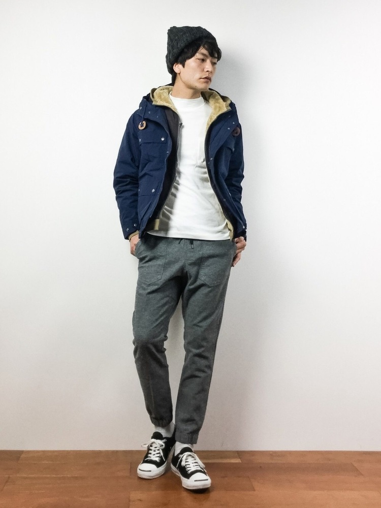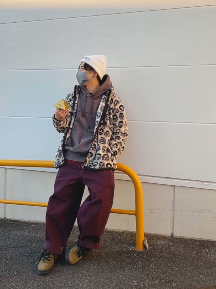 ジムマスターならではのスマイルイラストが描かれた、ボアジャケットを取り入れたメンズコーデ。インナーにはパーカーを挿して全体的にボリュームのある着こなしになっています。パーカー×パンツという定番の組み合わせに、ジムマスターのボアジャケットがアクセントとして効いていますね。