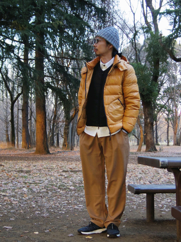 シャツとワイドパンツできれいめ感を演出しつつ、ダウンジャケットでカジュアルダウンさせたアウトドアライクなメンズコーデです。パンツとダウンジャケットは色味を統一して落ち着きのある印象に。
