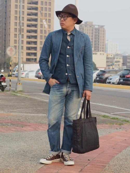 個性的なデザインのハットに、デニムで統一したスーツジャケット、ベスト、ジーンズパンツのコーディネイト。一見単調に見えますが、きれいに色落ちしたジーンズが全体に表情を与えています。そこにスニーカーを合わせたカジュアルコーデです。