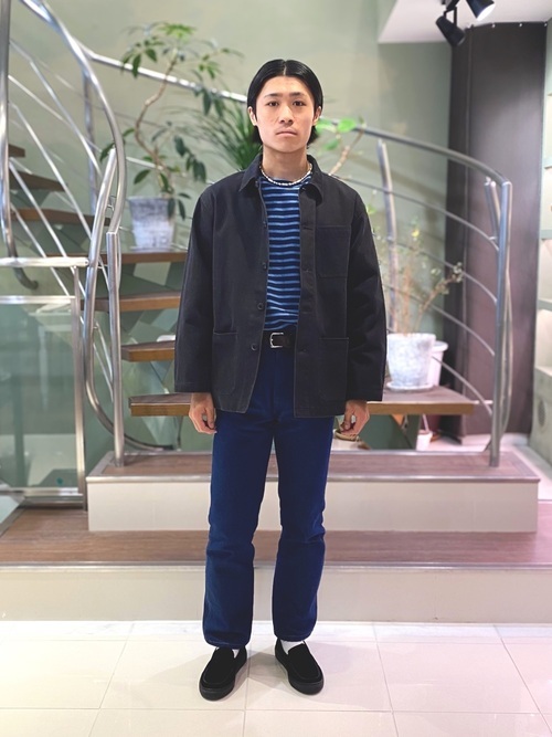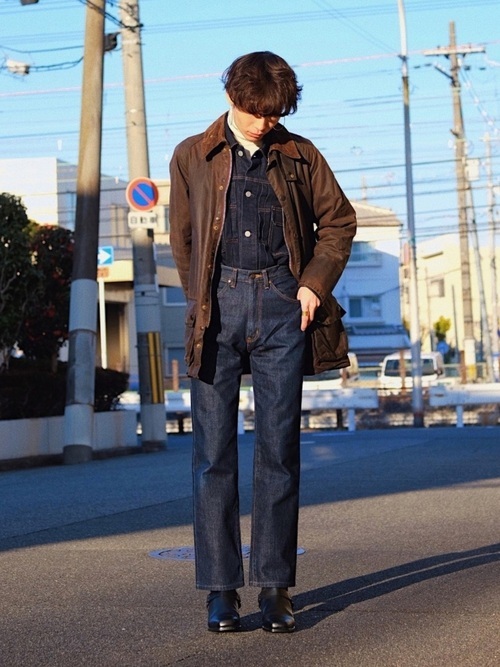 カバーオールにラングラーのジーンズをコーディネイトしたスタイル。足元にややカジュアルなローファーを持ってきているのがとてもおしゃれです。インナーのボートネックボーダーに遊び心が感じられます。