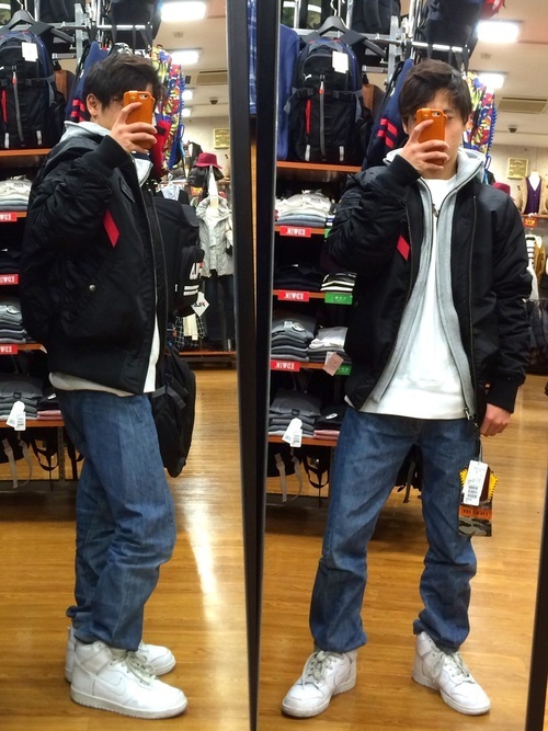 MA-1とジーンズの王道的スタイル。時代、服の流行に関係なくかっこいいコーデです。MA-1とゴツゴツしたラインのジーンズが無骨な印象を与えます。インナーの白とスニーカーの白がさりげなくリンクしています。