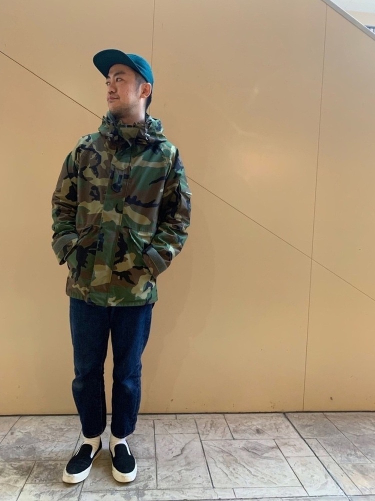雨水を通さない防水加工のされている迷彩柄のゴアテックスパーカーにドゥニームのジーンズを合わせています。迷彩柄には黒がよく合い、靴やキャップもシンプルなものを合わせると統一感のあるコーデになります。一見扱いにくそうな柄物ですが、他のアイテムを抑えめにすると大人っぽく着こなすことができますよ。
