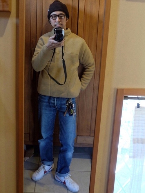 黒のニット帽とカジュアルなフリースを、ドゥニームのジーンズに合わせたコーディネート。シンプルながら、ジーンズのロールアップでこなれた空気感を演出しています。白のスニーカー、伊達メガネが遊び心のある大人な印象をみせています。ジーンズにテーパードが効いているため、もたついて見えずスリムな着こなしに仕上がっていますね。