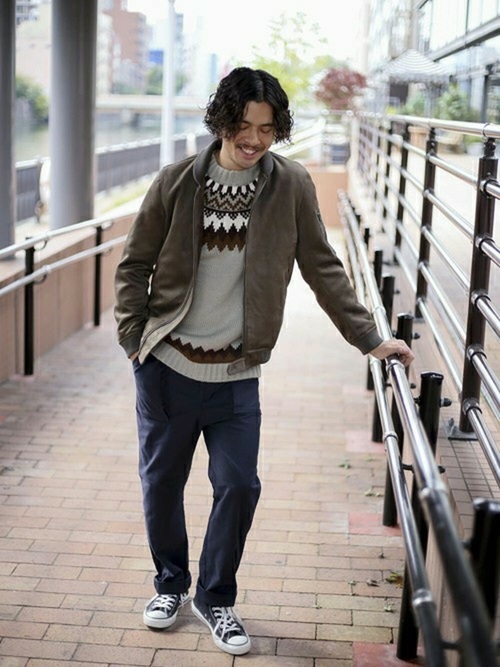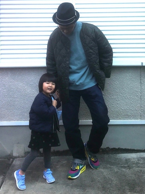 シックな色味のミリタリージャケットと、ドゥニームとの相性が抜群。メリハリを出す淡い色のスウェットが、スリムでスタイリッシュな大人な雰囲気をただよわせています。ナイキのカラフルなスニーカーもワンポイントでおしゃれ度をぐっとアップさせていますね。