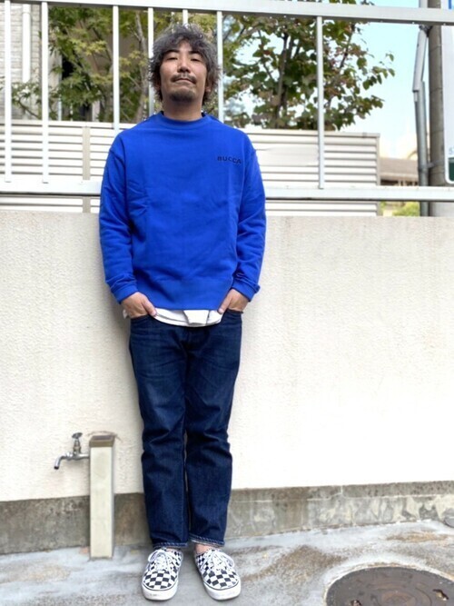 ブルーのスウェットがデニムのブルーと同系色で相性がよく華やかな印象をかもしだしています。ジーンズの脱力感のあるサイズ感がいい抜け感が出て、バランスよく着こなしていますね。