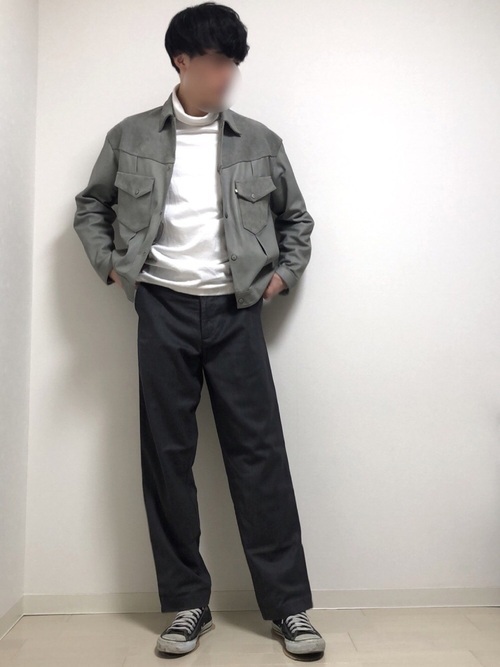 着用のデニムジャケットは、ウエストオーバーオールズと「JOURNAL STANDARD」というブランドがコラボしたアイテムです。部分ごとに切り替えたデザインが特徴で、デザイン性の高いジャケットです。種類の違うグレーのパンツと白のインナーでコーデして抜け感のある仕上がりになっています。