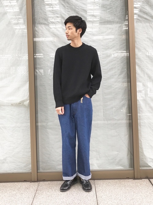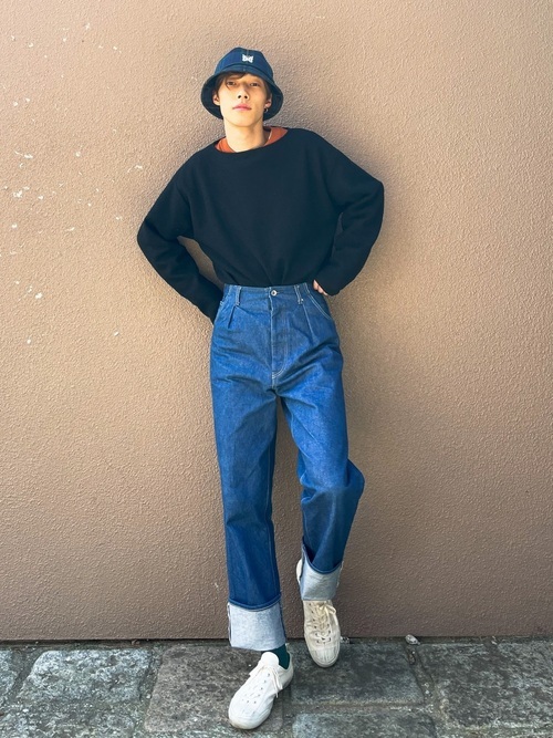 大胆にロールアップしたジーンズに、トップスをインしたスマートなシルエットがおしゃれなコーデです。デニムはウエストオーバーオールズの「109B DENIM」、黒のトップスは「H.UNIT STORE LABEL」というブランドのものになります。インナーに着ているオレンジが差し色になって暗くなりがちなコーデを華やかにしています。