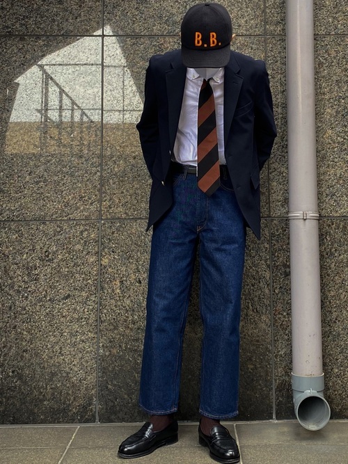 ウエストオーバーオールズのジーンズにネクタイ、ジャケット、キャップを合わせた技ありコーデです。ウエストオーバーオールズのジーンズはきちんと感もあるので、ジャケットと合わせるなど、遊び心あるコーデに仕上げたいときにもおすすめです。