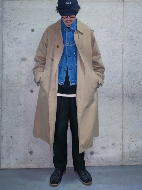デニムジャケット×ステンカラーコートコーデ