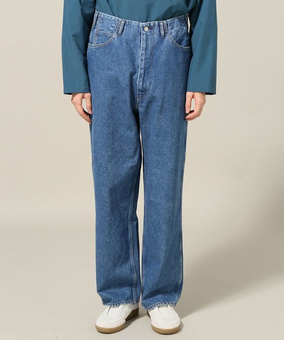 ウエストオーバーオールズのブランド定番デニム「801S」を着用したコーデです。ウエストオーバーオールズらしいストレートのシルエットと鮮やかなブルーが印象的です。シンプルな白のTシャツを合わせることでシルエットの美しさが際立ちます。