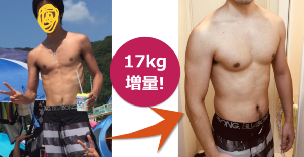 元はガリガリの体型でしたが、筋トレを始めて1年間で17㎏の増量に成功しました。n私が筋肉を増やして太ることができたのはプロテインのおかげと言っても過言ではありません。身体作りには筋トレももちろん大事ですが、プロテインを正しく飲んで筋肉を生成する材料を身体に供給することも同じぐらい重要です。n筋肉を増やしたいのであれは体重×2gのタンパク質を毎日摂取すべきと言われています。例えば、体重60kgの人であれば120gです。nこれを食事だけで摂取するとなると、コンビニのサラダチキンを1日に5個食べなければいけません。かなり厳しいものがありますよね。。。nタンパク質は食事だけでは必要な量を摂取しずらいので、プロテインで補う必要があるのです。n私もそうですが、そもそもあまり量を食べれないから痩せているのです。普通の人よりも太りにくい体質なので、プロテインなど文明の力を最大限に活用しましょう。