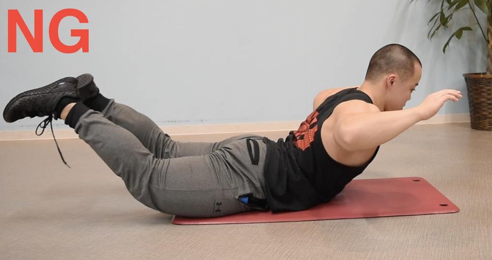 床で行うバックエクステンションでは画像のように上体を起こし過ぎないように注意しましょう。このような大きい腰の曲げ伸ばしは腰を痛める原因になってしまいます。例え脊柱起立筋狙いの動作であっても、胸やみぞおちから丸め込むように動作を行ってください。