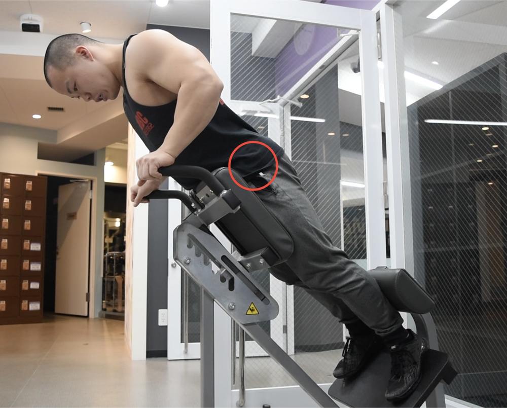まずはマシンのパッドを正しい位置にセッティングします。先ほど紹介した脊柱起立筋を狙ったバックエクステンションとは違って、腰骨の突起がパッドから上に飛び出るようにマシンを設定しましょう。