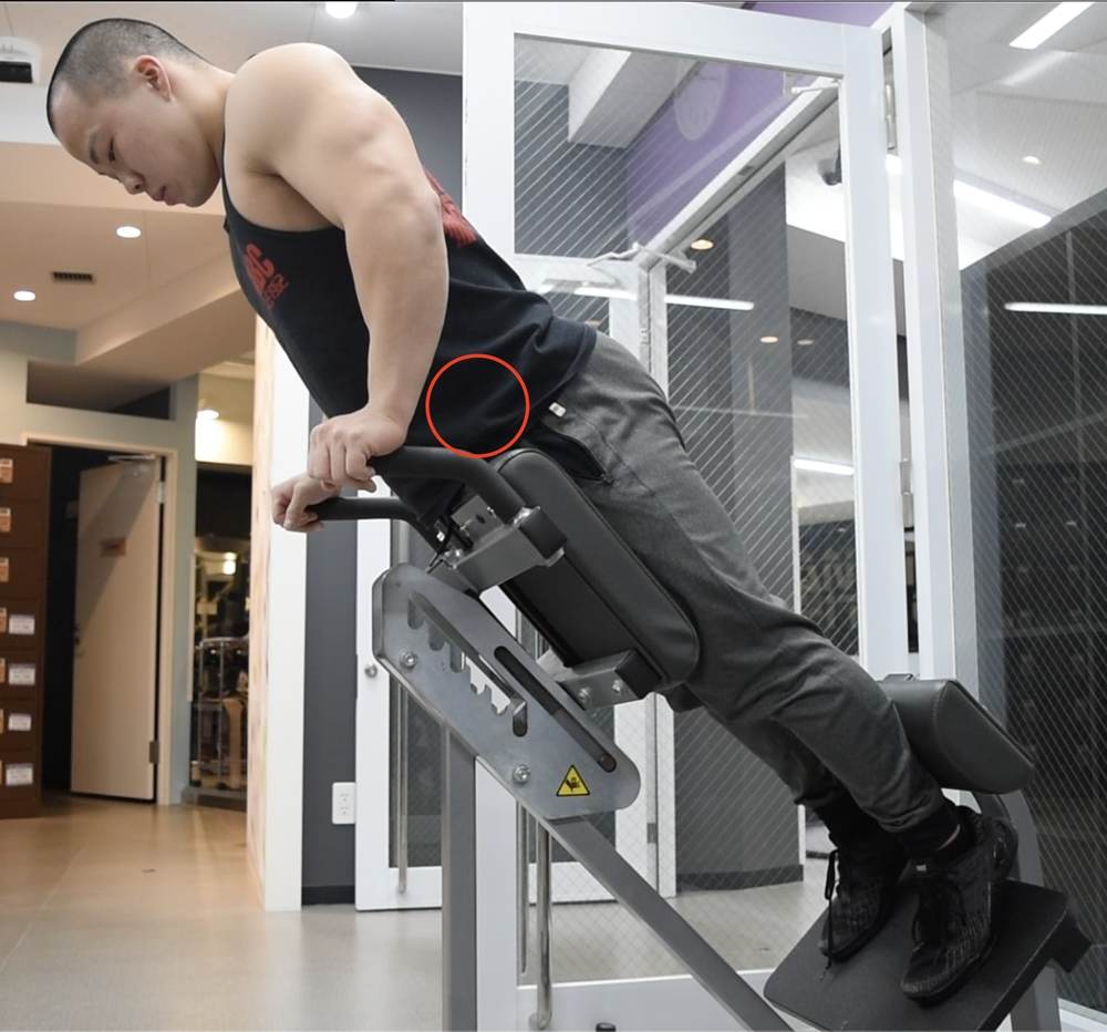それでは次に専用台を使って脊柱起立筋の強化を狙うマシンバックエクステンションのやり方を紹介します。先ほどと同じ自重だけで行うトレーニングですが、可動範囲が大きくなっているのが特徴です。