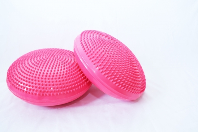 バランスディスクは元々は医療用として開発されたアイテムで、アジリティディスクとも呼ばれています。空気が入ってクッション状になったディスクに小さい突起がついたものが一般的で、その上で立ったり、トレーニングを行うなどして活用されているアイテムです。