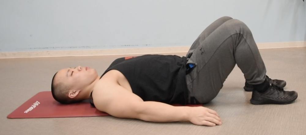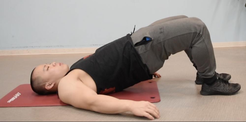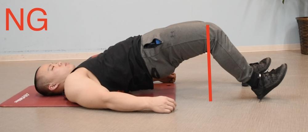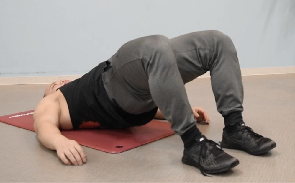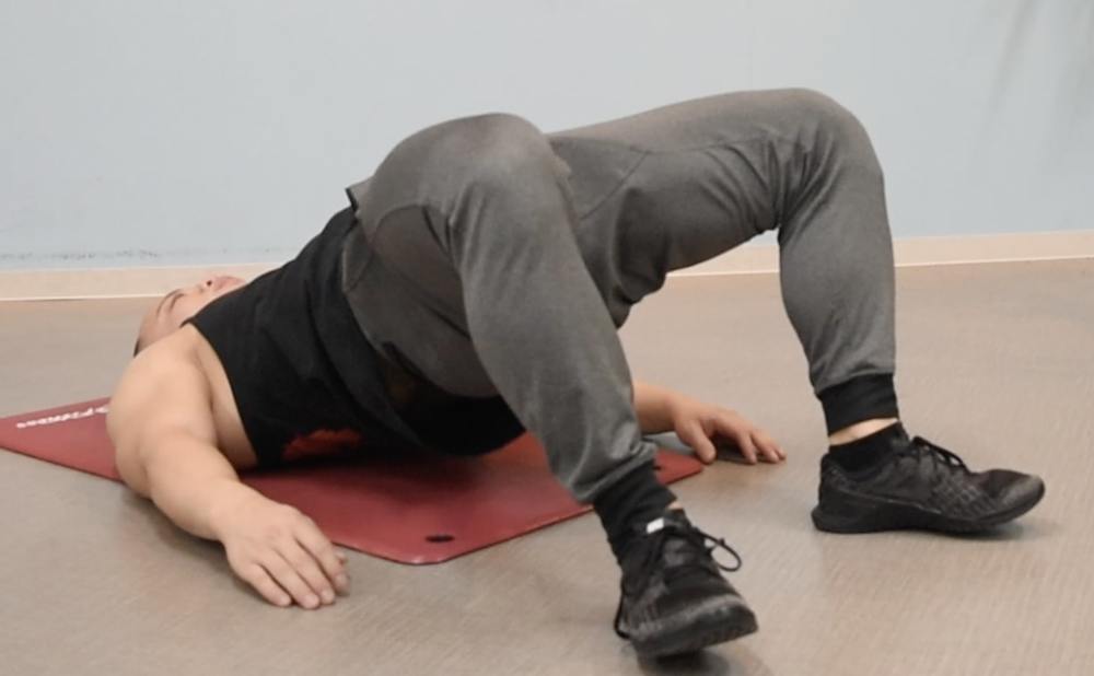 ②背中上部は床に付けた状態で、お尻を真上に向かって上げる
