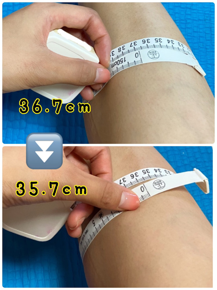 女性は下半身に脂肪が付きやすいので、着圧スパッツも活用しつつフォームローラーでケアすることはとても効果的です。画像を見ても太ももに隙間ができており、痩せたことが目に見えて分かります。ふくらはぎも痩せており、元はO脚のように見えますが痩せたことで真っすぐな脚になっています。