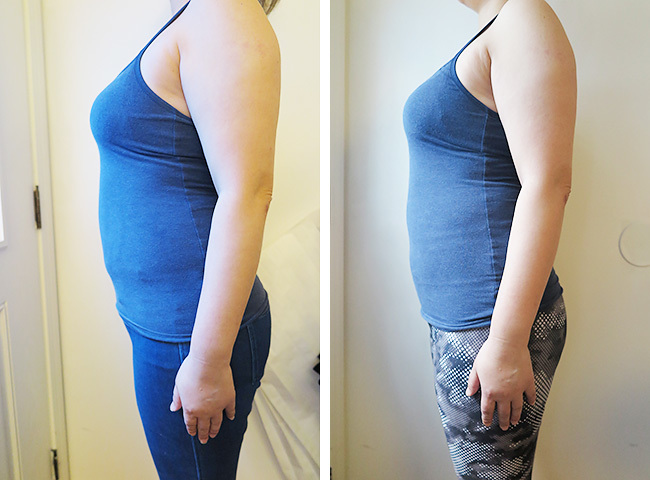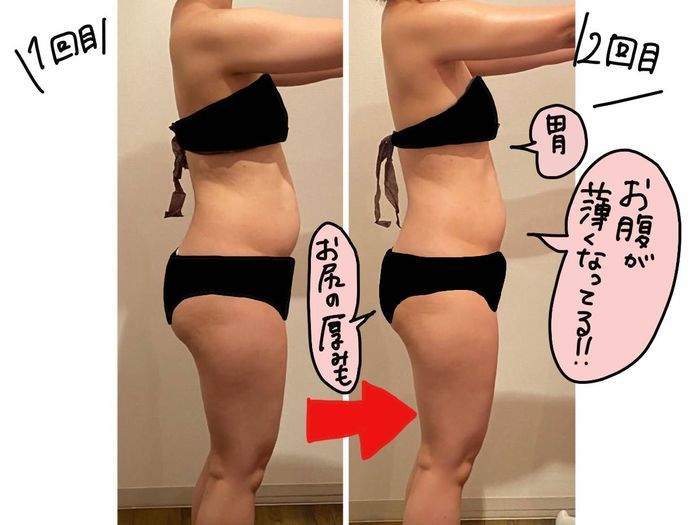 体が冷えやすく、老廃物が溜まっていると中々ダイエットの成果は出ません。お尻やお腹がとても薄くなり、太ももも張っている感じが緩和され脚痩せも抜群。お尻が小さくなったことでヒップアップしたようにも見えます。そして二の腕も引き締まっているので、フォームローラーとサロンでの筋膜リリースのダブルの効果が目に見えて分かります。