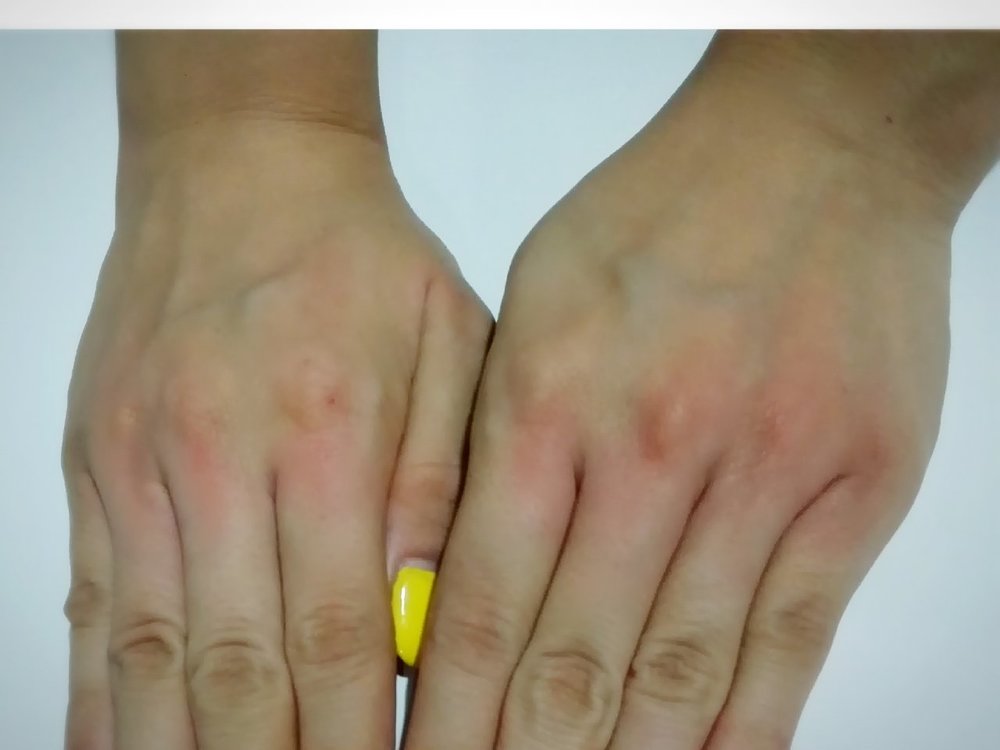 好転反応のあざは打撲・挫滅等でできるあざの様に内出血を起こしているわけではないため、痛みがなく、時間が経って赤黒く変色することもありません。好転反応の場合は写真の通り、赤い小さな斑点、いわゆる湿疹が集まることで赤いあざのように見えています。打撲と好転反応と見分ける際は、あざが湿疹の集合体か観察すると判断できます。