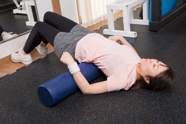 あまりハードに行わない方が良いタイミングのため、フォームローラーのような凹凸があるものではなく、ヨガマットやバスタオルを丸めた柔らかい素材で行います。バスタオルであれば、どの家庭にもあるのですぐに取り入れることができますね。