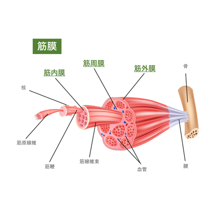 筋膜とは、全身の筋肉を覆っている膜のことをいいます。長時間にわたり椅子に座るなどの同様の姿勢を続けたり、同じ作業の継続によって筋肉に負荷がかかってしまっていると、この膜が周辺の筋肉と癒着してしまいます。この癒着を改善するエクササイズを「筋膜リリース」といいます。