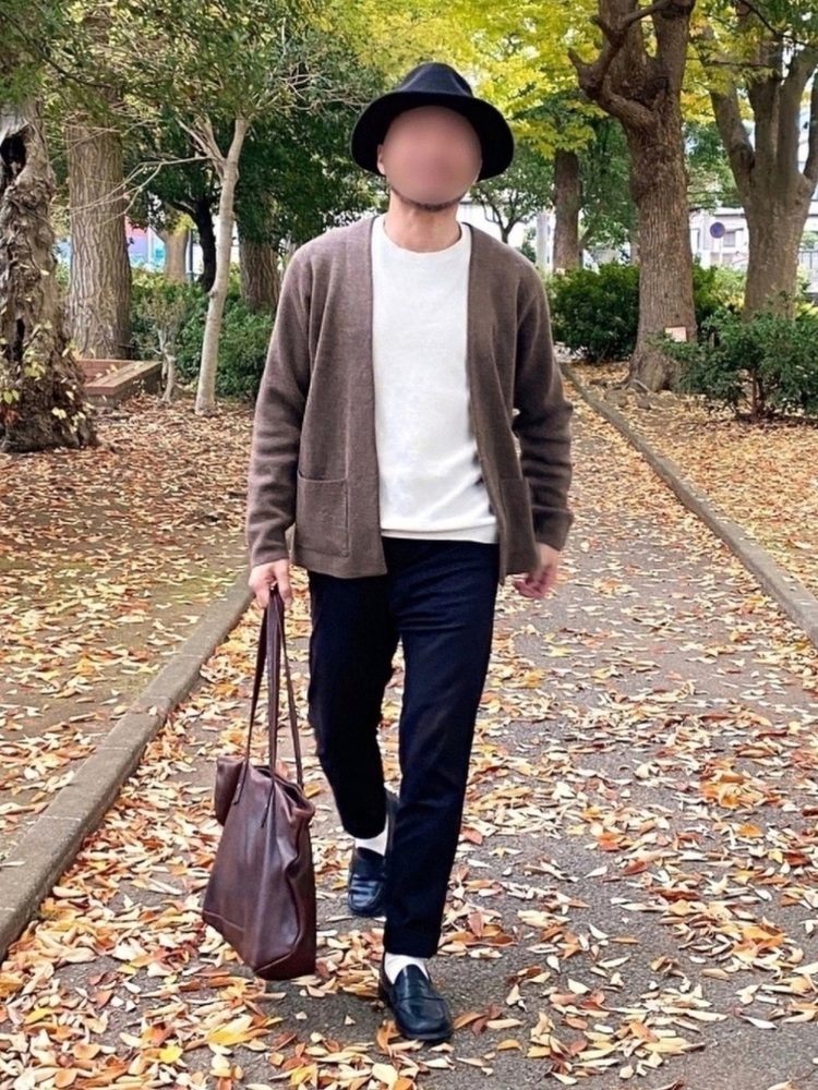 白シャツにカーディガンのシンプルなメンズコーデです。茶色系のアイテムを取り入れると、一気に秋の季節感がでるのでおすすめです。ハットやローファーで40代ならではのかっこよさを演出しましょう。ハットをかぶって視線を上に誘導することで、低身長をカバーすることができます。