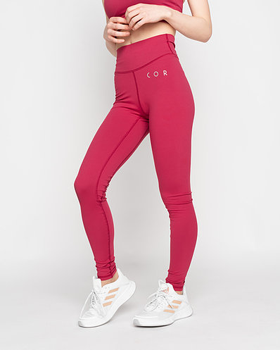 フィット感抜群のハイウエストデザインのレギンスです。ナイロン87%、伸縮性の良いスパンデックス13%の素材でシルエットがきれいにみえます。光る素材からなる『COR』のロゴがキュートです。色はラズベリー、クールグレイ、ブラックから、サイズはXS、S、Mから選べます。