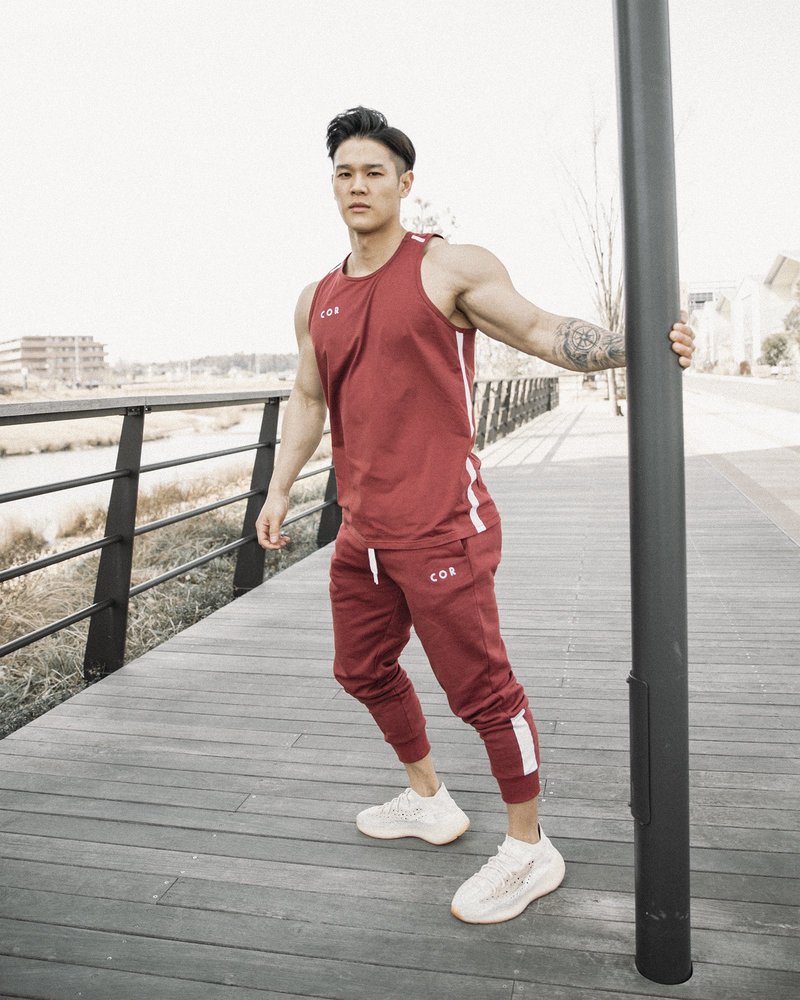 タンクはコットン95%、スパンデックス5%の素材で、鍛え上げられた筋肉をよりきれいに魅せるフィット感を重視しています。ストレッチがきいているので、フィットしている割にトレーニング中も動きやすく着心地は抜群です。肩が大きく見えるデザインで、色は落ち着いたきれいな色のバーガンディとブラックから、サイズはS.M.Lから選べます。