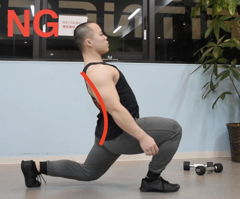 背中が曲がってしまう動作はNGです。これは視線が下に落ちた状態で動作を行うとよく起こります。バックランジを行うときは、視線をまっすぐ前向きにし、をニュートラルな状態に保つようにしましょう。そうすることで、首からの連動で背中や腰が曲がることを防ぐことができます。