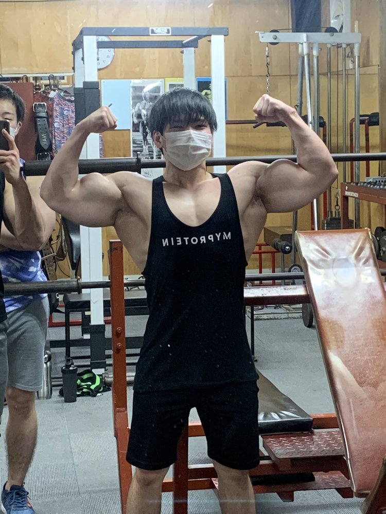 こちらのトレーニングジムでの1枚からは鍛えられた上半身の、特に肩と腕の筋肉の大きさが伝わってきます。腕の太さが顔の大きさと同じくらいになっていますね。
