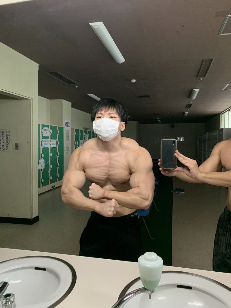 こちらの鏡の前でポージングしている姿も、くっきりと入った大胸筋の線を見ることができます。土屋優記本人もこの身体に対して、「胸の線がいつもより元気」と表現しています。大きく発達した僧帽筋も素晴らしいです。