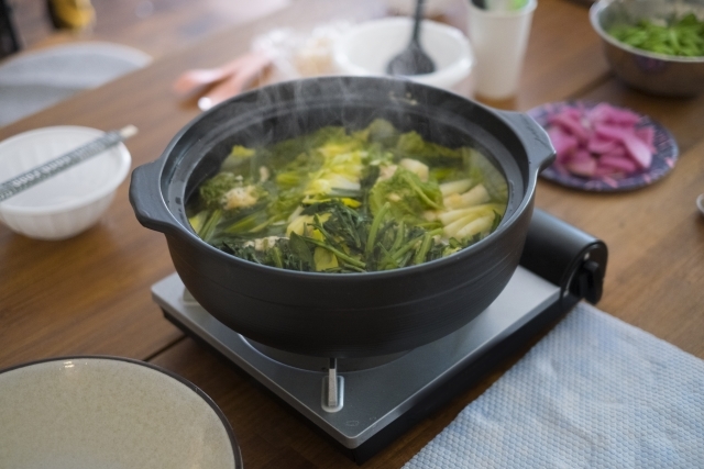 ⑩ほうれん草となめこを入れて、ひと煮立ちさせる