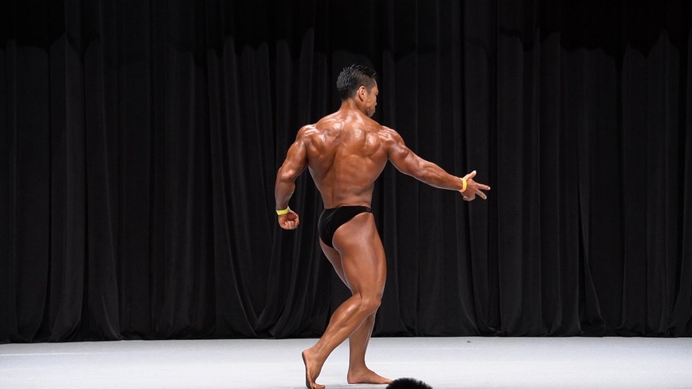 2019年JBBF日本男子ボディビル選手権大会で4位に入賞したときの画像。上腕二頭筋と大腿四頭筋の発達具合が素晴らしい1枚です。