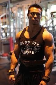 獲物を狙う恐竜のような鋭い視線が特徴の1枚。体にフィットするタンクトップから、どれほど胸板が分厚いか想像できます。
