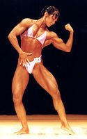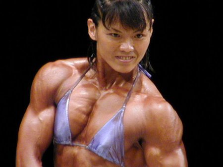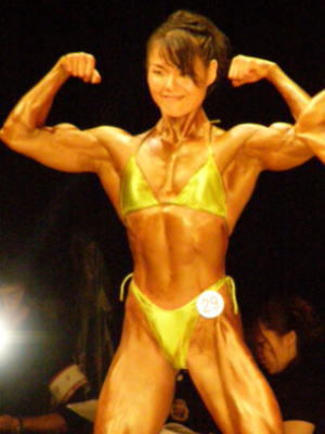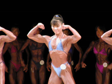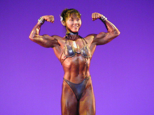 2004年に開催された女子日本ボディビル選手権で初優勝を飾ったときの西本朱希の筋肉です。余分な脂肪は一切なく、大胸筋の盛り上がりの凄まじさがはっきりと分かります。