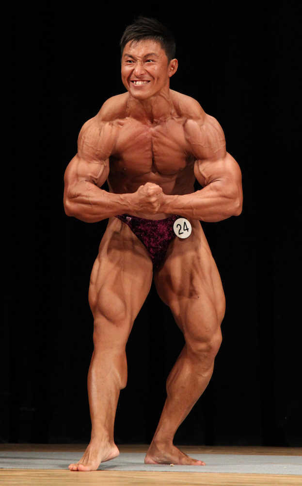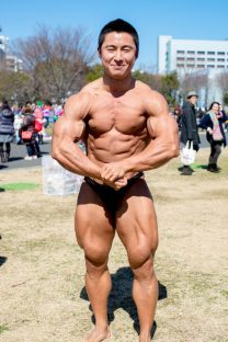 こちらは一般イベントに参加した、日本ボディビル選手権4連覇の頃の鈴木雅です。日の当たる場所で見ると、筋肉の陰影がよりはっきりとします。