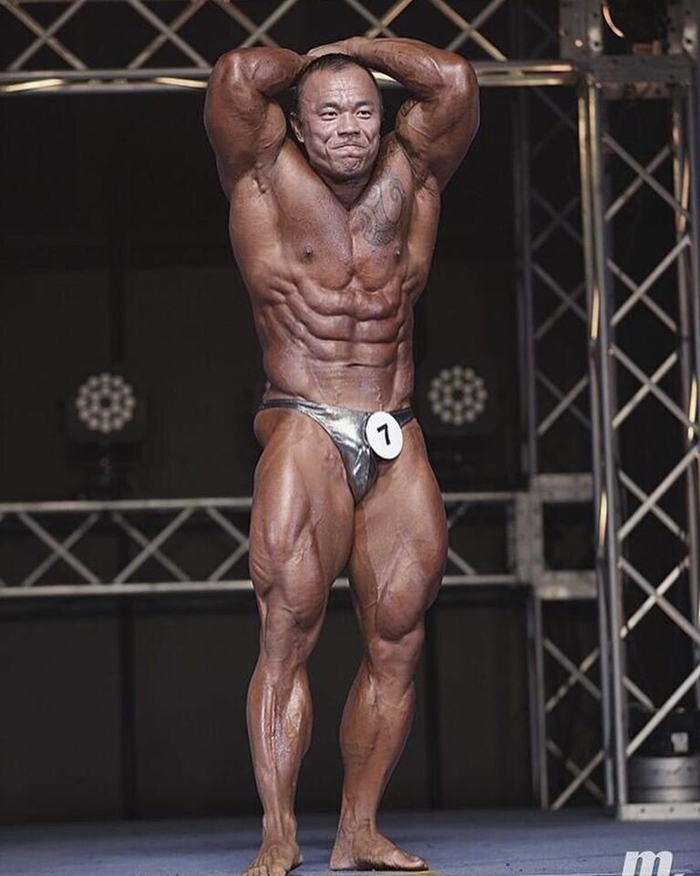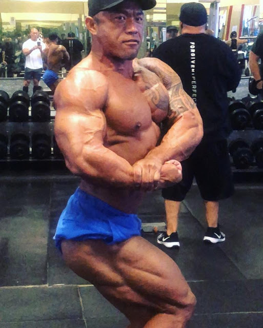 大会本番前にパンプアップさせているようです。肩周りから腕の筋肉が太く仕上がっています。