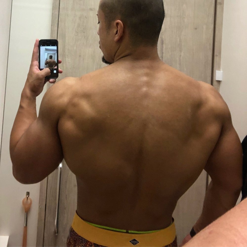 ポパイ関根による、水着着用時の背中の自撮りです。やはり腕の筋肉に目が行ってしまいますが、背中の筋肉もかなりのものです。