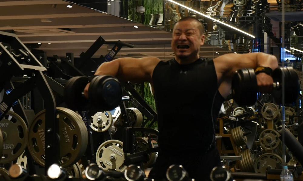 こちらは、サイドレイズを行うポパイ関根の画像です。ちょうどダンベルを持ち上げるときのショットなので、声が聞こえてきそうなほど臨場感がある一枚でもあります。