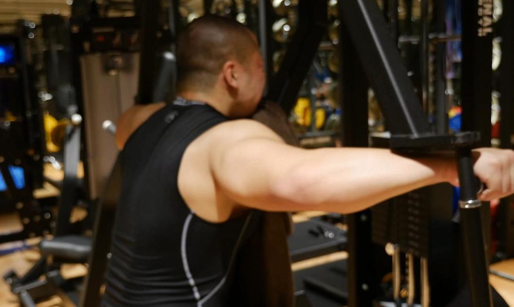 続いては、マシンリアレイズに取り組む際のポパイ関根の写真です。マシンもタンクトップも黒色なので、肌色の腕の筋肉がよくわかる一枚になってます。