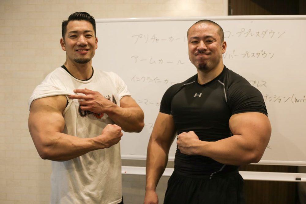 竹本直人とのツーショット写真で、右側の黒い服を着ている方がポパイ関根です。二人とも笑顔が印象的ですが、腕の筋肉の迫力はなかなかのものです。