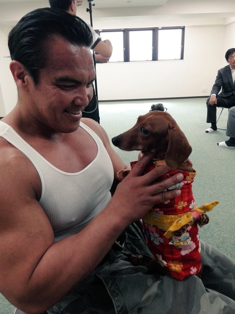 犬を愛でる北井大五ですが、大胸筋と上腕二頭筋がでか過ぎて犬が小さく見えてしまいます。