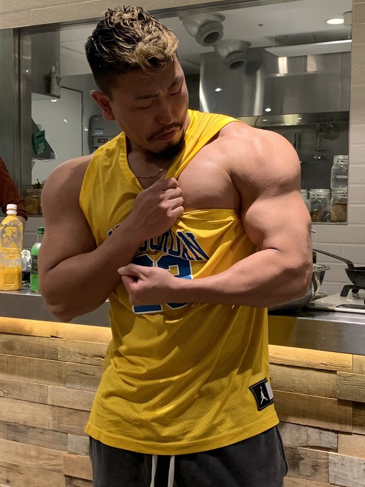タンクトップを着用した大橋源紀です。腕をまくっているので、筋肉のデカさがより強調されています。