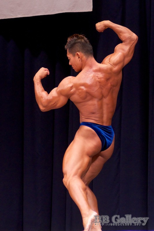 2013年にゲストとして登壇した大会でのポージング。背中はもちろん、下の方の角度から谷野義弘のお尻をのぞけるのはありがたいですね。