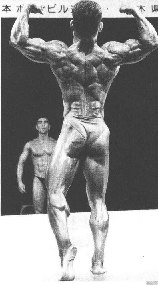 谷野義弘の独壇場になったという東日本大会でのバックダブルバイセップス。前年から大きく成長し、東京大会の直前に仕上がった体を見せつけています。