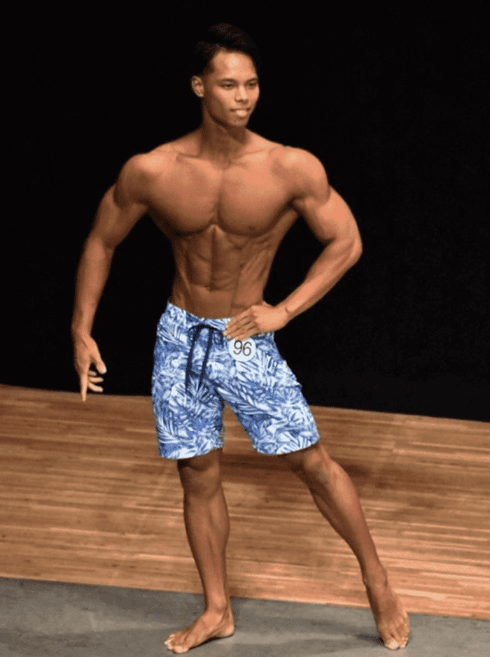 この画像は、2018年のオールジャパンメンズフィジークに出場した時の身体です。やはり2017年と比べると三角筋がより発達して肩幅が広くなっていて、理想的なフィジーク体型に近づいています。